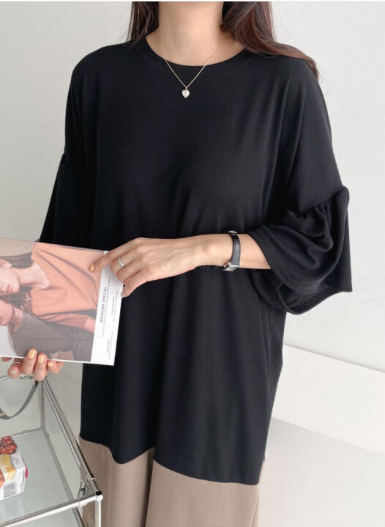 ・さらっとしたカットソー地にリラックス感のあるシルエットで仕上げました。・シンプルですがお袖のフレアデザインがさりげないアクセントに。・1枚ではもちろん、デニムやレギンスとレイヤードするのもオススメです。