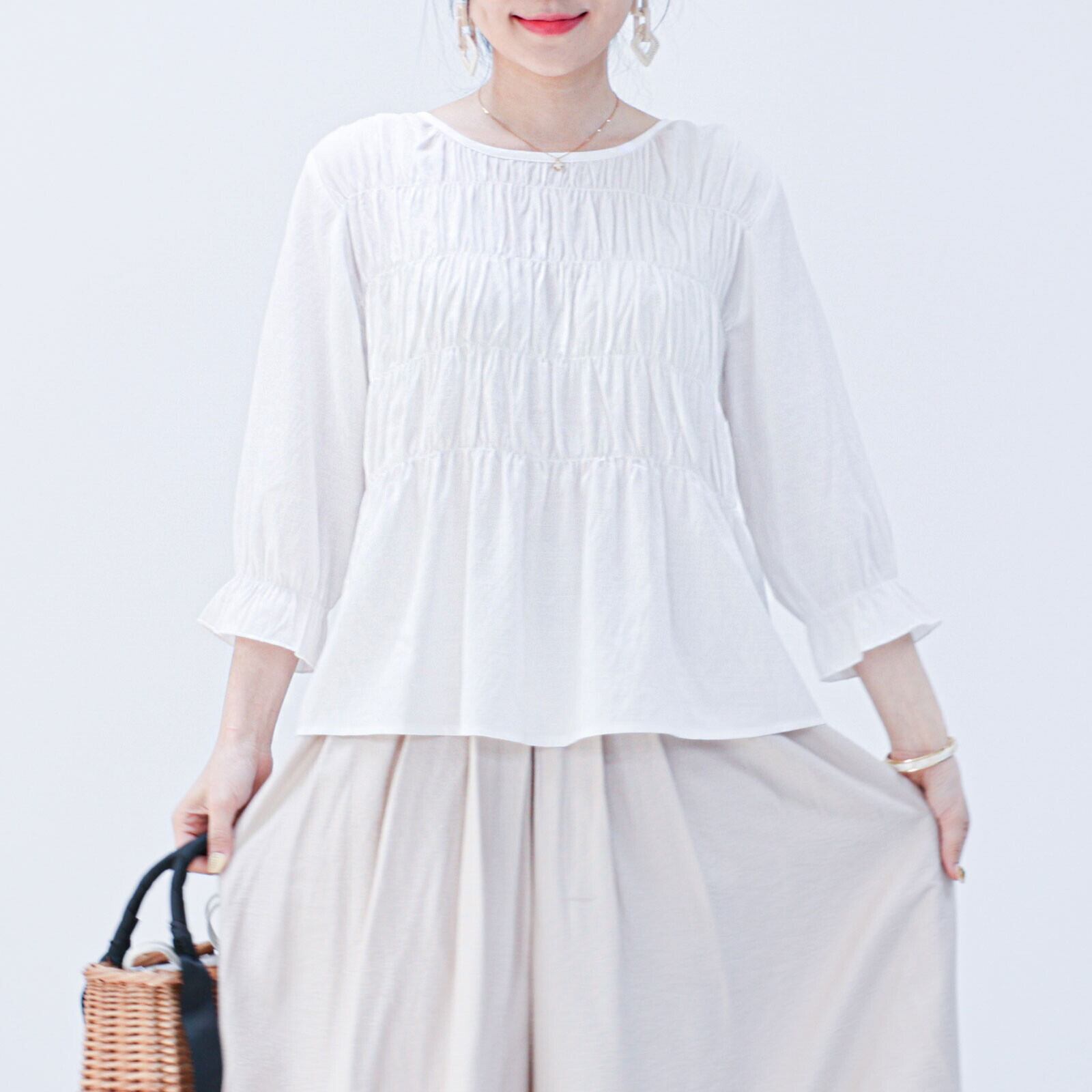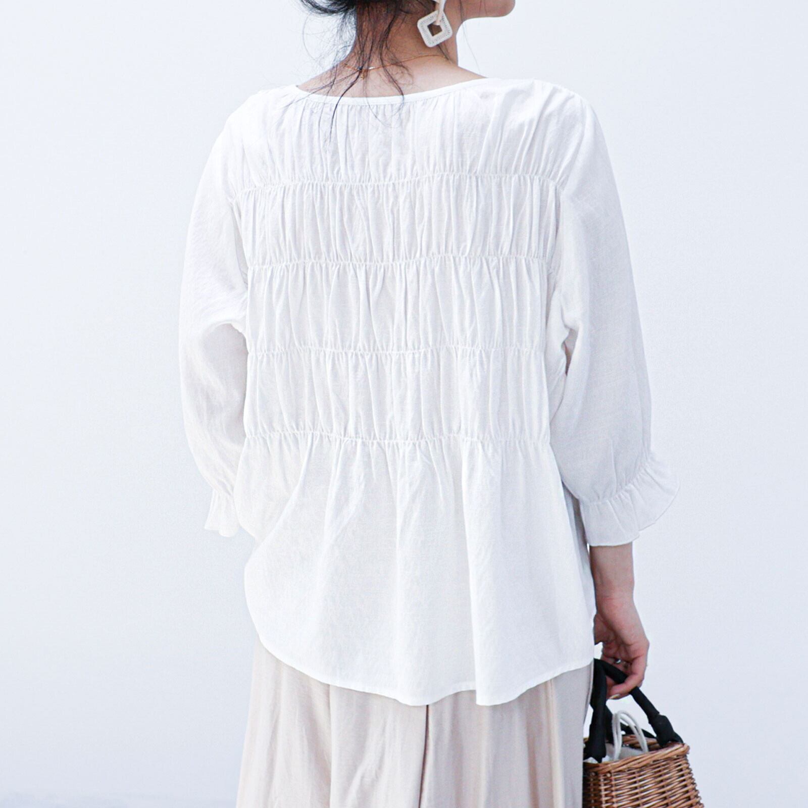 ・前後にワッシャー加工を施したデザイン・フリル袖が女性らしさをUP・シンプルながらディティールにこだわりがあり、フェミニンな1着になっています。