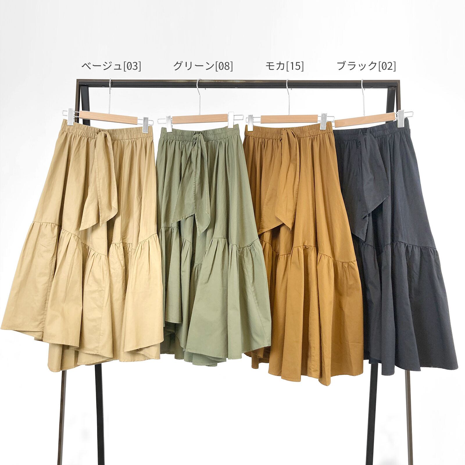 [デザイン]・ウエストはゴム仕様になっているので穿き心地が快適。・トレンド感のあるティアード風スカート。・ウエスト部分にリボン付き。